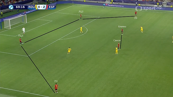 Испанию можно подловить на разворотах мяча. Дело в том, что оба хавбека выдергиваются на уходящих в глубину цп. Когда соперники умышленно опускаются в полуфлангах, то растягивают испанскую полузащиту. Взлом происходит при поочередном вытягивании обоих цп – в таких случаях в центре образуется дыра. Ни Бланко ни Баэна не отличаются скоростью или чтением игры в защите, из-за чего дальний хавбек не успевает сместиться к центру и закрыть линию паса.
