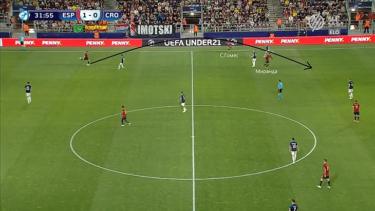 Испания уязвима к переводам на свой правый фланг. Слабость проявляется, когда правый защитник Гомес оказывается с вингером 1-в-1. В таких ситуациях он предпочитает выжидать- плассируется на полусогнутых, но с опозданием начинает вступать в отбор/единоборство. Еще один недостаток фулбэка - слабая координация. Перед пробросом вингеру достаточно было просто делать ложные движения корпусом перед, ведь испанец зачастую не успевал выбивать мяч в подкатах. Как итог, левые вингеры соперников могли как обыгрывать Гомеса в лицевую, так и уходить от него на смещениях в центр.
