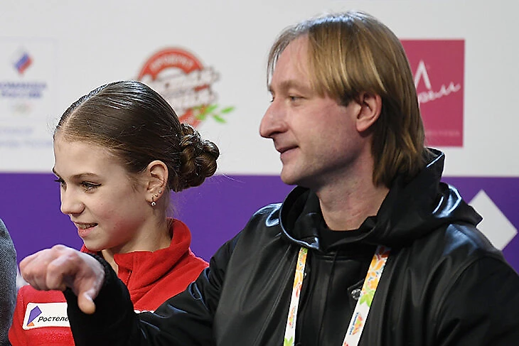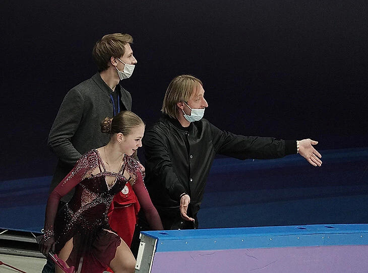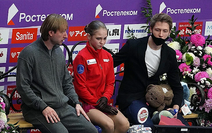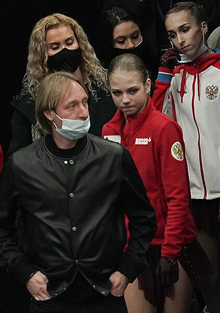 Плющенко на соревнованиях сидел с Сашей в КиКе и часто устраивал шоу: негодовал от оценок за короткую на Гран-при России (Трусова тогда проиграла Косторной и Туктамышевой, а тренер показал палец вниз), напевал что-то под нос и нахваливал Сашу («бам-барам-барым-бумба» – вы же помните?).