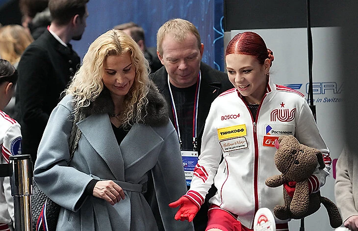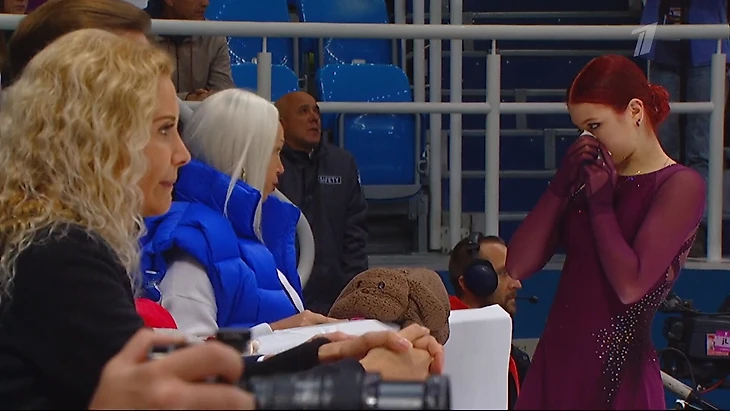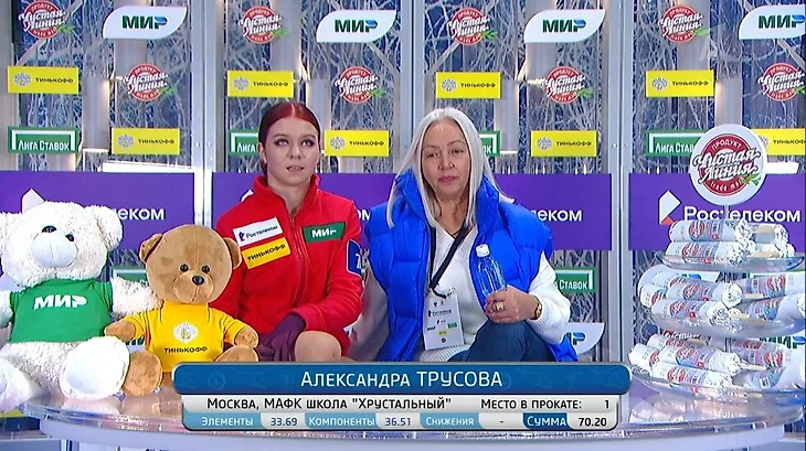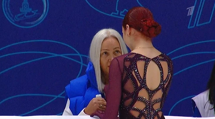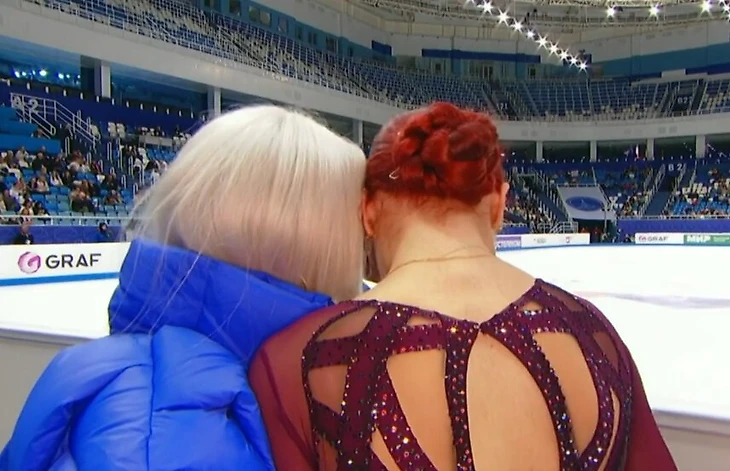 Тутберидзе тоже была на катке – она приехала с Аделией Петросян, которая выступала сразу после Трусовой. Операторы специально поймали отличный кадр: Саша на фоне бывшего и нового тренеров.