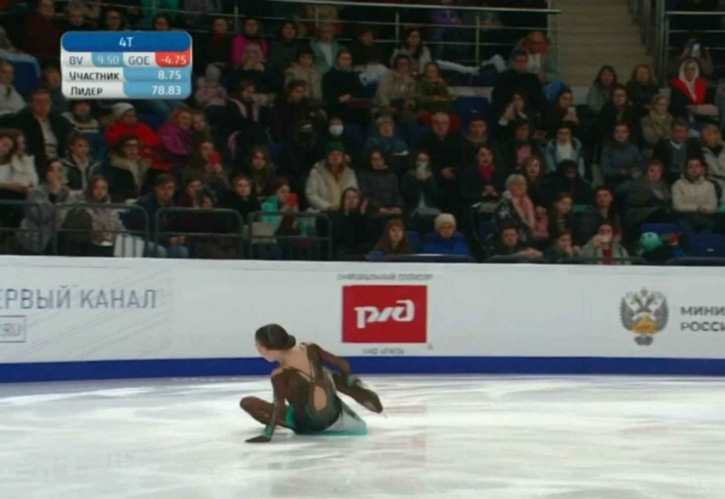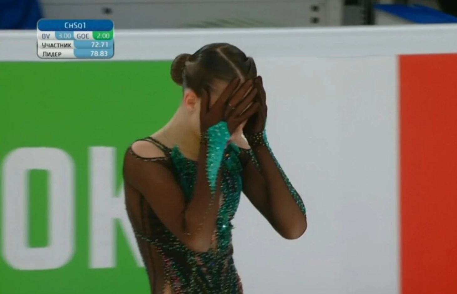 Сегодня Акатьева явно спустилась – сорвала первые три прыжка (все ультра-си): упала с трикселя и дважды с четверного тулупа (один из которых планировал в каскаде с двойным акселем).