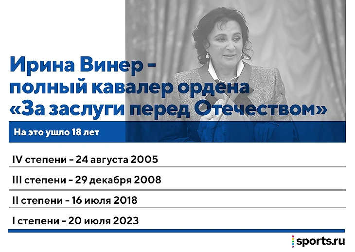 К тому же у Винер есть и другие государственные награды: орден Почета, орден Дружбы, знак отличия «За благодеяние», почетный знак «За заслуги в развитии физической культуры и спорта».