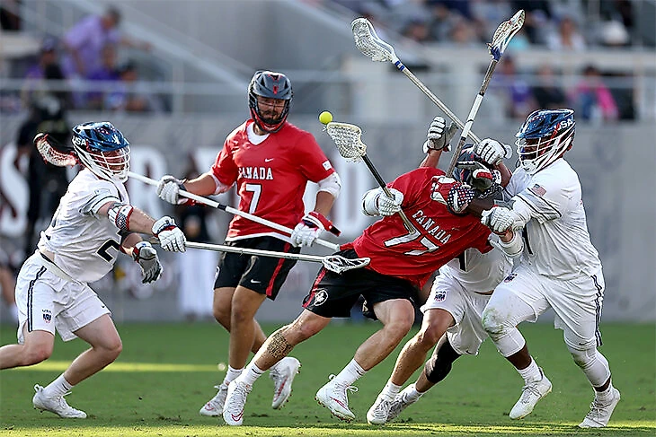 Лакросс – командная игра, в которой небольшой резиновый мяч ловят и забрасывают в ворота специальной клюшкой с сеткой. Вид контактный и травмоопасный, из-за чего играют в защите под формой и мощных шлемах, почти как в американском футболе.