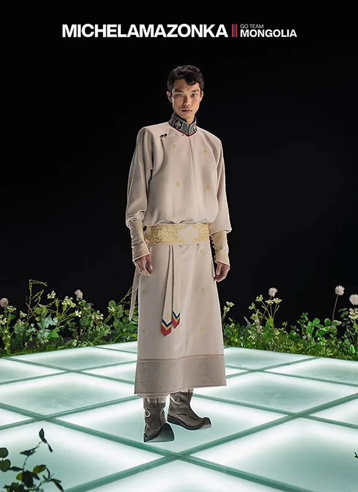 ● Дизайн придумали сестры Мишель и Амазонка Чоугала из Улан-Батора, работающие под брендом MICHELAMAZONKA. Они сделали два комплекта – один для знаменосцев, второй для остальных спортсменов. По словам дизайнеров, на создание одного комплекта в среднем уходило по 20 часов, а на весь процесс потрачено три месяца.