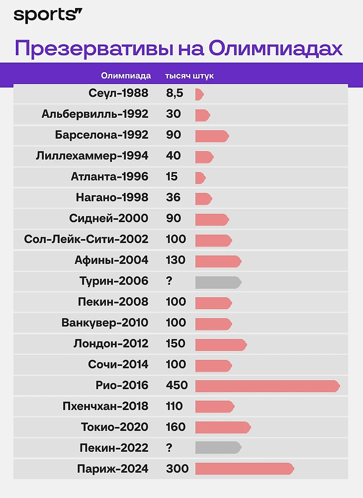 На зимней Олимпиаде-2022 в Пекине ковид-ограничения все еще действовали, но от традиции с раздачей презервативов не отказались. Правда, точное число так и не назвали, поэтому на нашем графике в начале текста вы видите знаки вопроса.