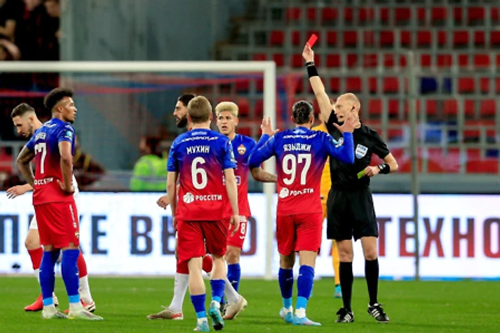 На 37-й минуте встречи произошел довольно нетривиальный эпизод с участием ВАР. После фола в центре поля ВАР позвал Москалева еще раз пересмотреть эпизод с участием игрока ЦСКА Максима Мухина, на предмет прямой красной карточки («по горячим следам» арбитр не показал никакую карточку). После перепроверки Владимир Москалев показал полузащитнику желтую карточку и игра возобновилась. Эпизод необычен тем, что обычно в подобных случаях судья принимает одно решение из двух: либо подтверждает свое изначальное решение, либо удаляет игрока с поле. Можно ли вообще, проверяя красную карточку, показывать желтую?