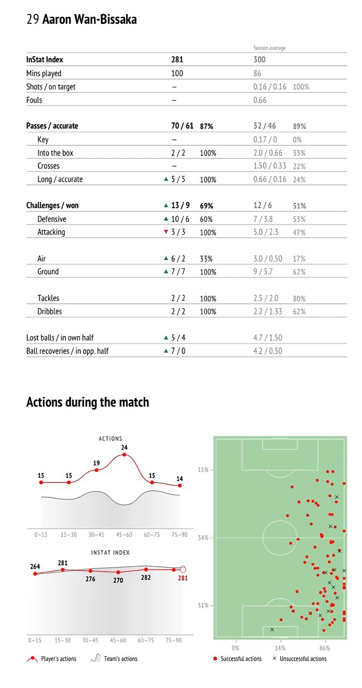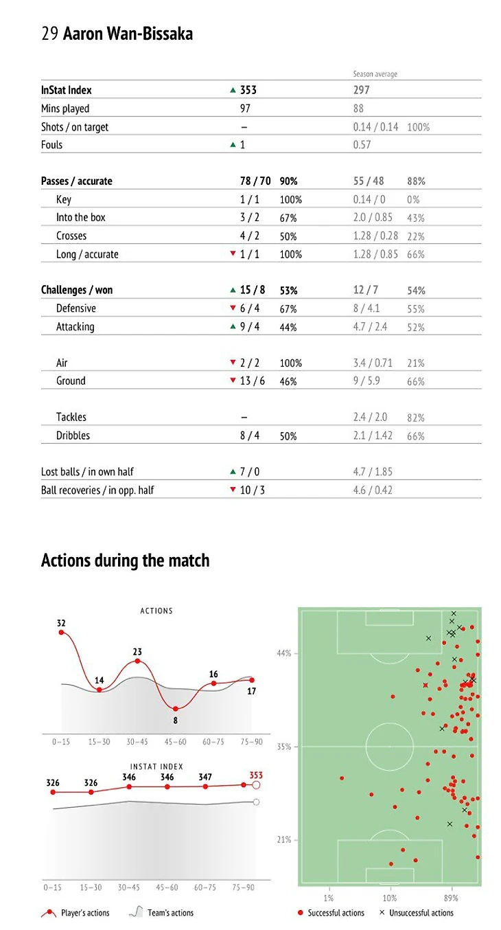 В новом сезоне англичанин заметно прибавил в игре в нападении, являясь одним из лидеров команды по количеству обводок и точных передач в штрафную соперника. Ниже статистика InStat из матчей против Виллы и Эвертона. Помимо этого, Уан-Биссака продолжает совершать сэйвы(по-другому не скажешь) в своей штрафной – отбитые удары против Вулверхэмтона, Вест Хэма и Эвертона.