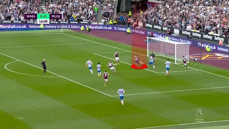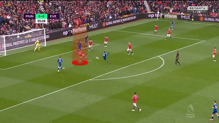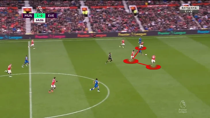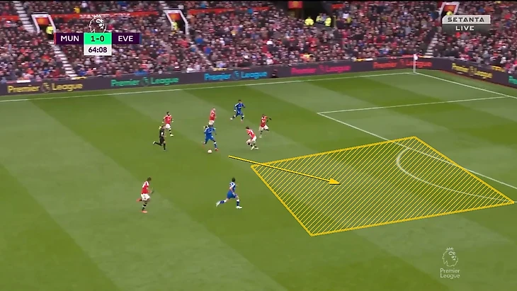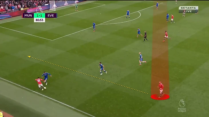В матче с Эвертоном не лучший свой матч провел Люк Шоу. Видимо, последствия травмы и отсутствие постоянных партнеров (Магуайр и Рэшфорд) влияют на Люка. В некоторых моментах он не делает перекрестных забеганий, чтобы освободить партнеру зону(ниже пример с Джейдоном Санчо).