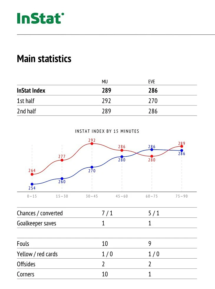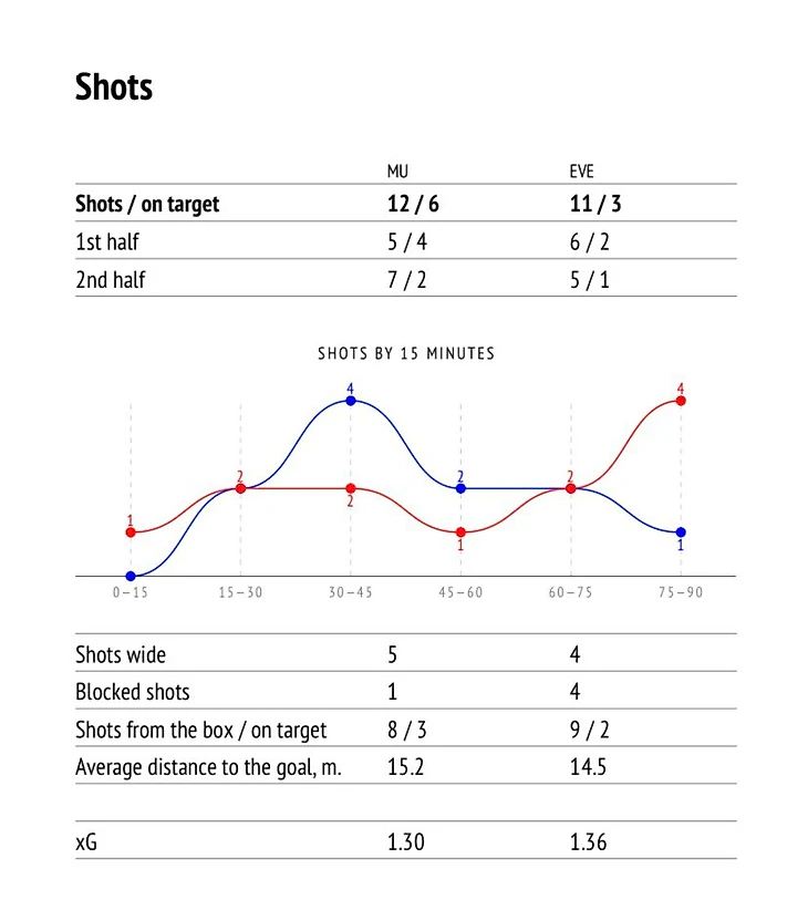 В матче против "ирисок" у Юнайтед было вдвое больше ударов в створ в каждом из таймов, но по-настоящему опасным стали лишь удары Марсьяля и Кавани, среди них и забитый мяч. По xG соперники почти равны, так что исход встречи можно считать справедливым, Манчестер не создавал угрозы, имея на поле одну из лучших атакующих групп в АПЛ. Помимо этого, 10 угловых у ворот Эвертона закончились ничем. Это - открытые вопросы в адрес тренерского штаба.