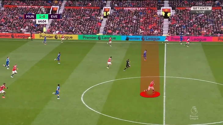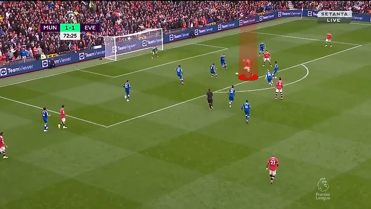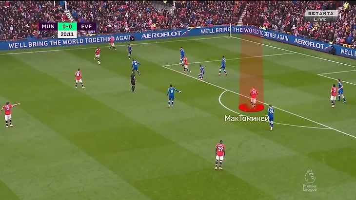 1) Роль МакТоминея в атаке. Мы знаем, что Скотти в академии долгое время играл роль форварда, в то время как в первой команде его больше используют в роли опорника. В отдельных матчах прошлого сезона (6-2 с Лидсом, 9-0 с Саутгемтоном) Оле просил МакТоминея подниматься выше для поддержки и даже завершения атак. Так происходило и в первом матче против Лидса, и после возвращения шотландца на поле, ниже пара скриншотов из игры с Эвертоном. Видно, что шотландец является дополнительной атакующей единицей, способной и пробить издали, и войти в штрафную площадь.