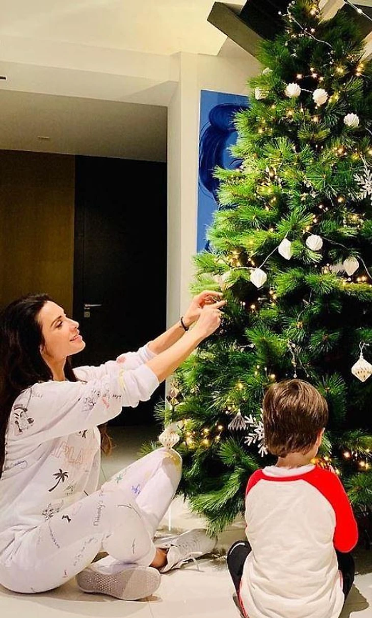 Пилар Рубио (жена Серхио Рамоса) украшает елку вместе с сыном.
