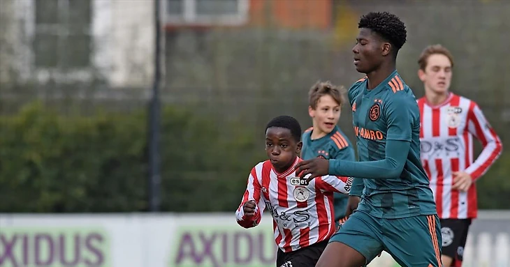 В сети появились фотографии с матча молодежных команд (U-15) "Аякса" и роттердамской "Спарты". Дэвид Исмон играет на позиции защитника и ему всего лишь 14 лет, но посмотрите на сколько он отличается от игроков соперника. Рост Исмона составляет 190 см.
