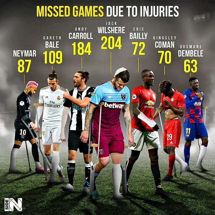 Игроки с наибольшим количеством пропущенных матчей из-за травм