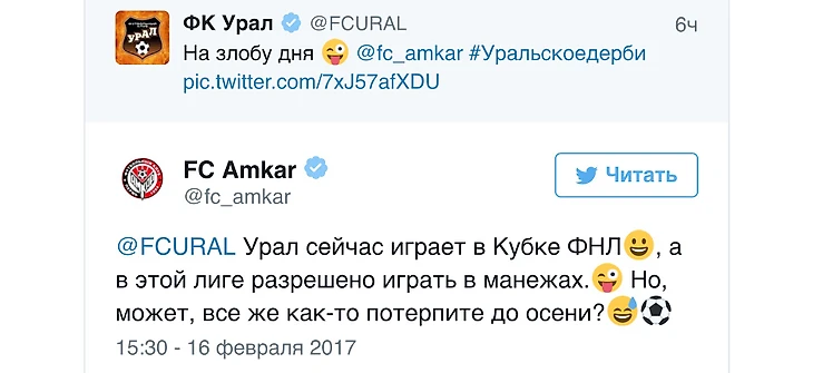 А пока главным событием дня стала пикировка пресс-служб участников уральского дерби. По общему мнению, она осталась за "Амкаром". И это не может не радовать. Праздник возобновления сезона совпал с принципиальнейшим матчем: и в такие дни надо соревноваться во всем - в рамках закона, разумеется. И на поле, и на трибунах, и в рисовании банеров, и в выдумывании кричалок.