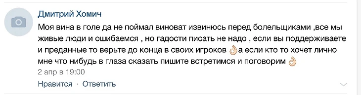 Этот комментарий голкипер красно-черных оставил на ВКонтактовской страничке «Амкара» - там, где болельщики обсуждали гол, который он пропустил в матче с «Тереком».