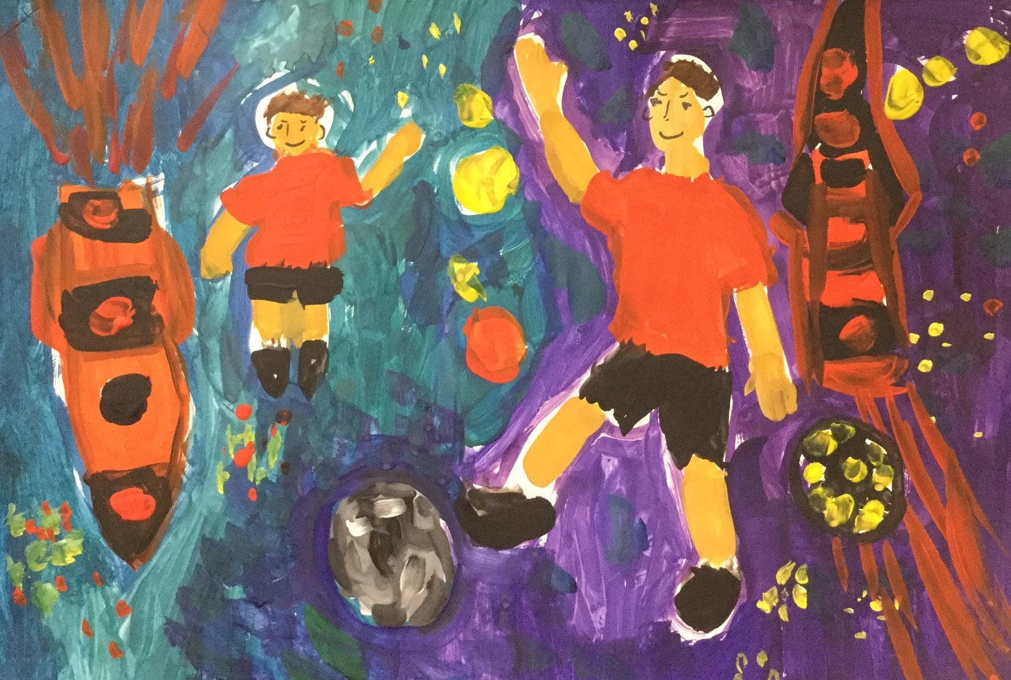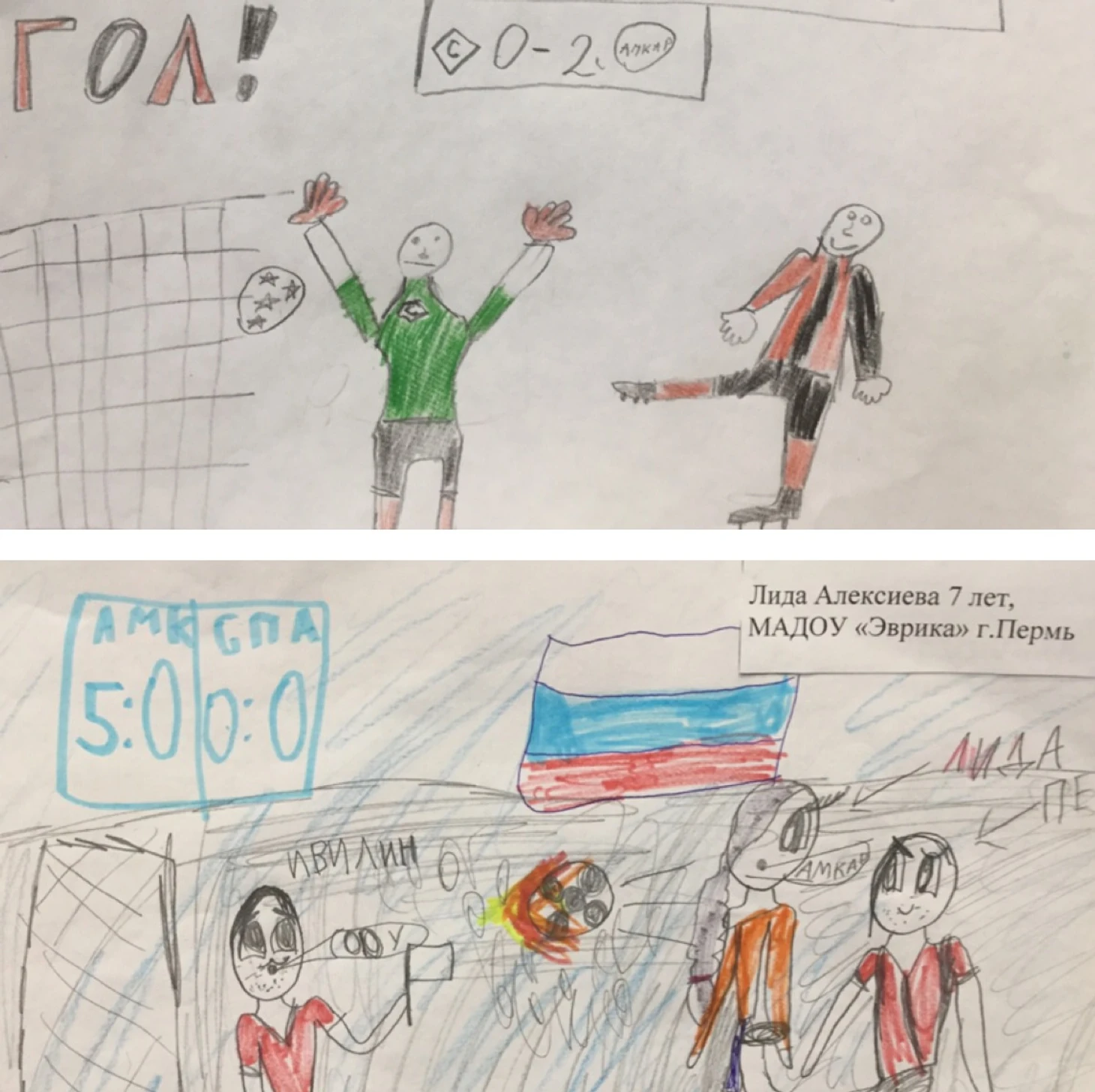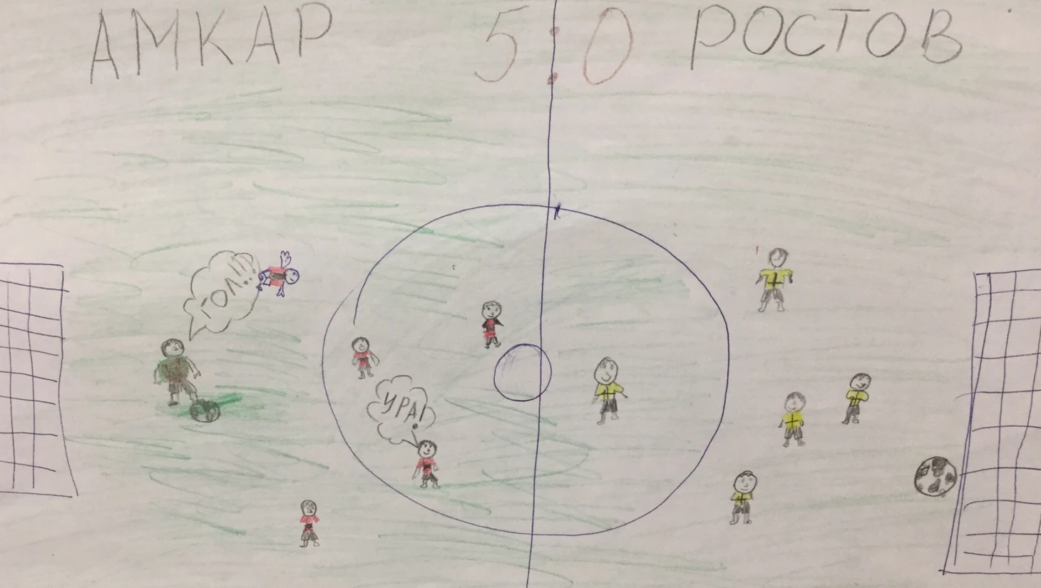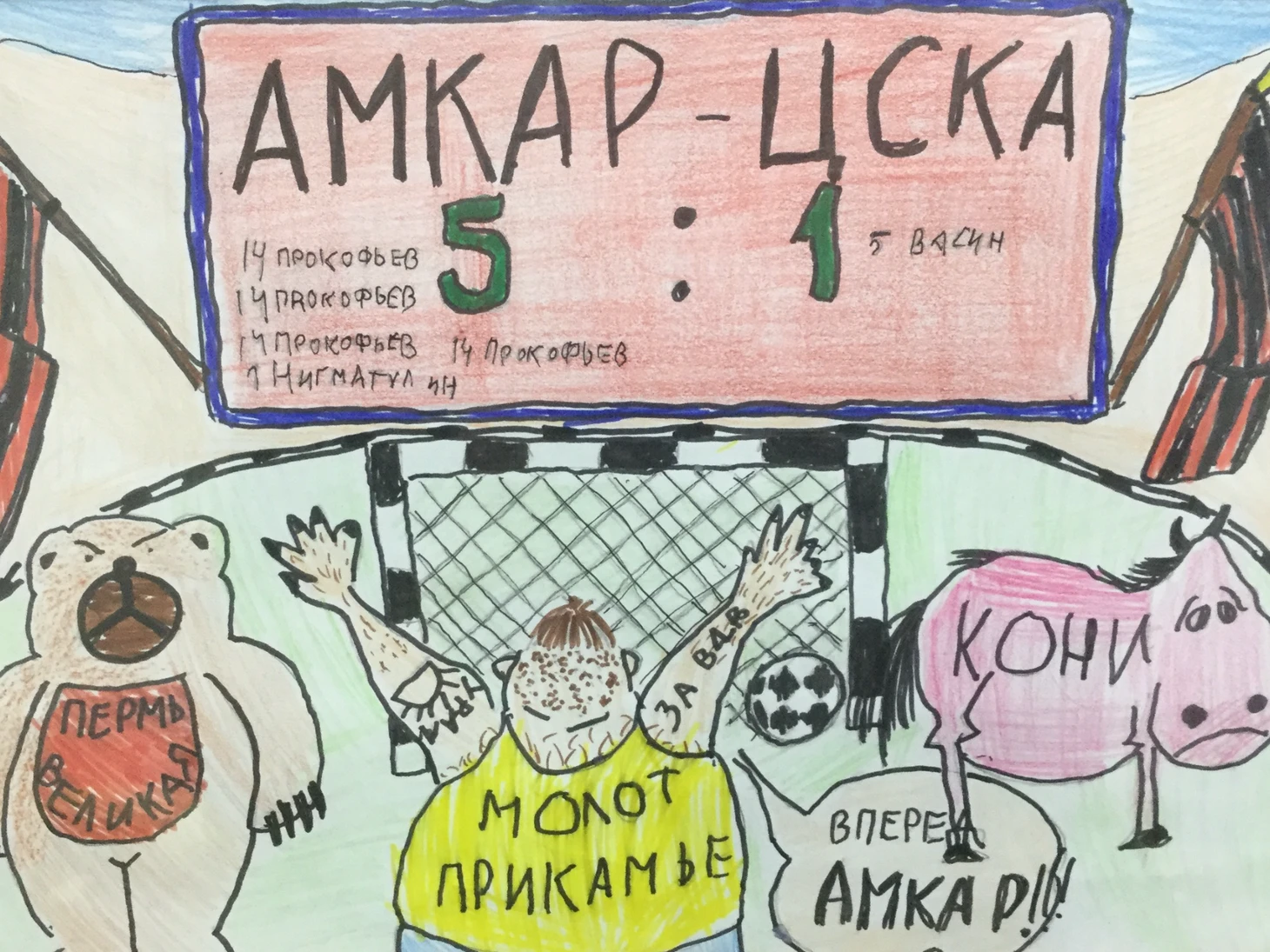 Теперь пройдем в Зал Скальпов. Он наполнен жестокой конкретикой по отношению к некоторым соперникам «Амкара». Интересно, что в их числе – не только гранды отечественного футбола, но и другие клубы. Если детские мечты сбудутся, им всем не поздоровится. Обращаем особое внимание на шедевр, открывающий экспозицию - юный художник предусмотрел буквально каждую деталь!