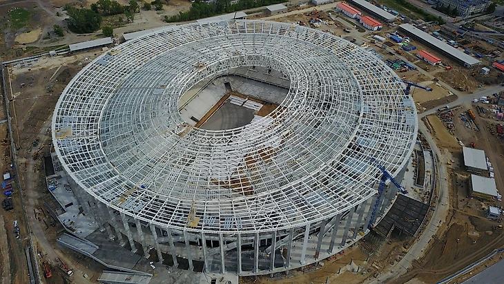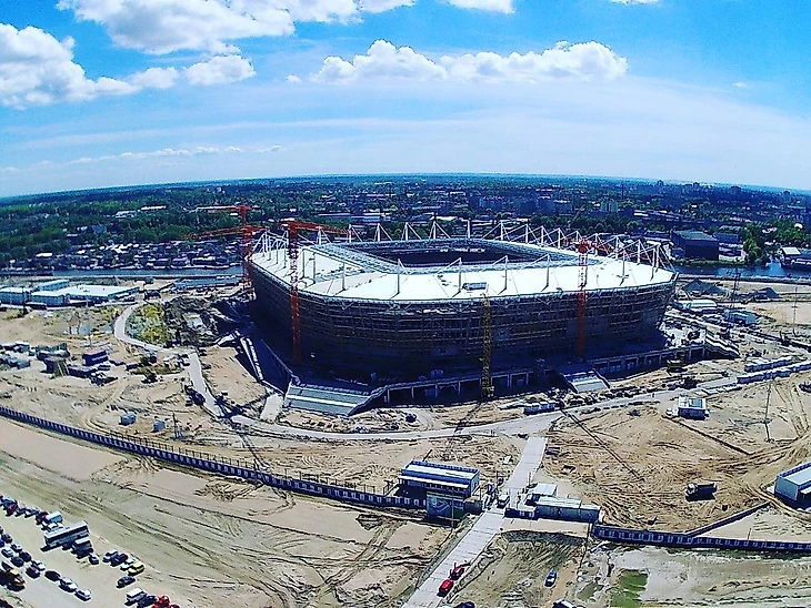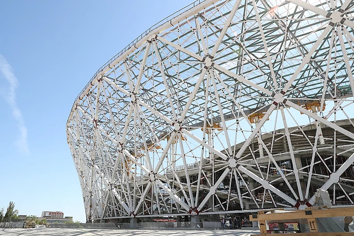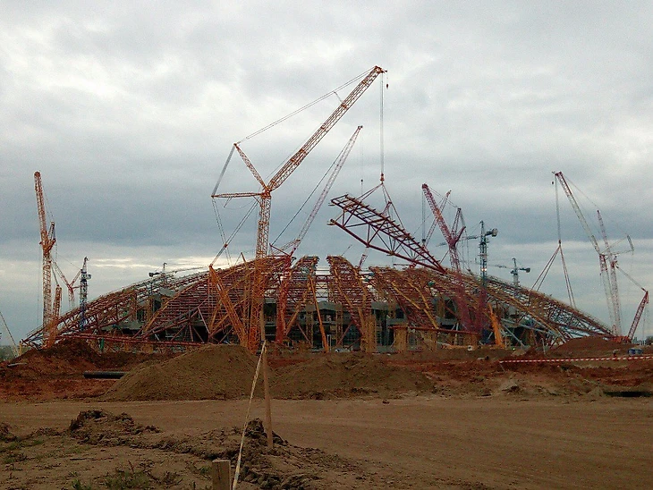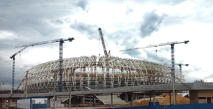 Самарский стадион пока самый отстающий. Здесь продолжают собирать многострадальную крышу, возведение которой множество раз тормозилось то перебоми в поставках металлоконструкций, то иными проблемами с подрядчиками. В последние несколько месяцев темпы заметно возросли, и местные строители в сроки обещают уложиться.