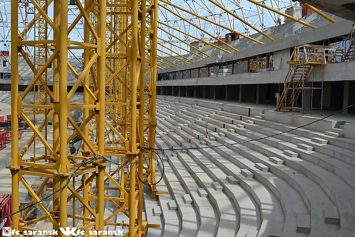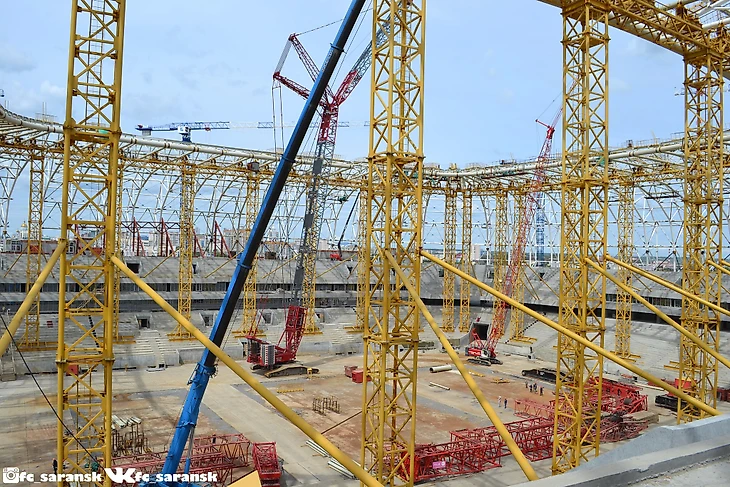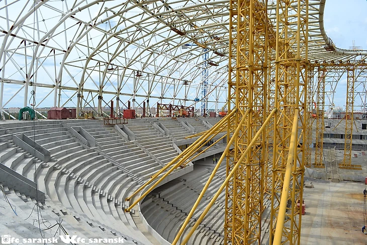Года полтора назад стадион в Саранске был лидером среди семи представленных в этом посте стадионов, однако, затем стройка практически встала. И вот, в этом году всё вновь пошло как по маслу. Железобетонные работы завершены, каркас крыши собран (буквально на днях). В ближайшее время, по всей видимости, будут разбирать опоры крыши, выводить из чаши стадиона технику, и обустраивать основание поля.