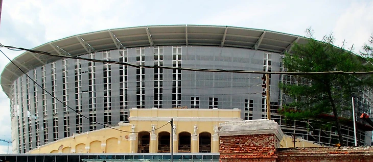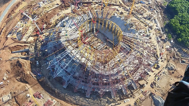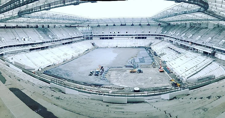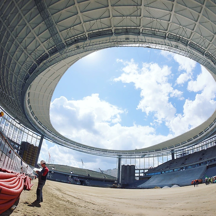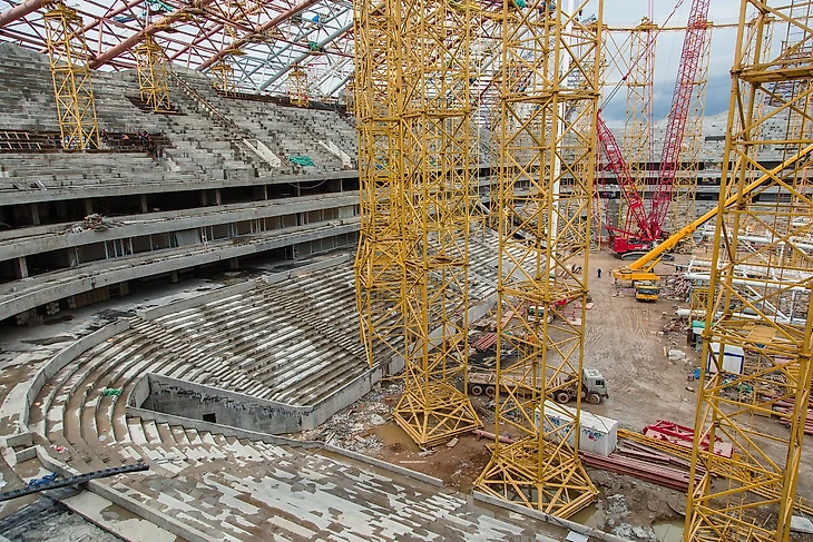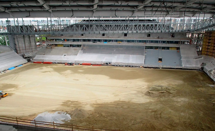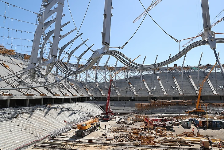 Здесь, в отличие от двух предыдущих арен, до поля пока не добрались, и тому есть объективные причины. Для начала необходимо закончить подъем вантовых конструкция крыши. Впрочем, этот этап находится в завершающей стадии.