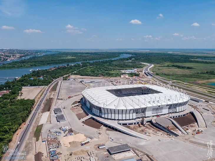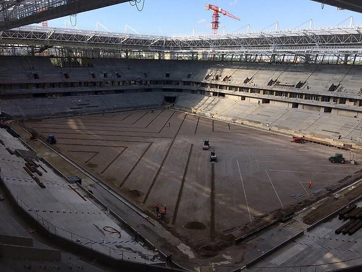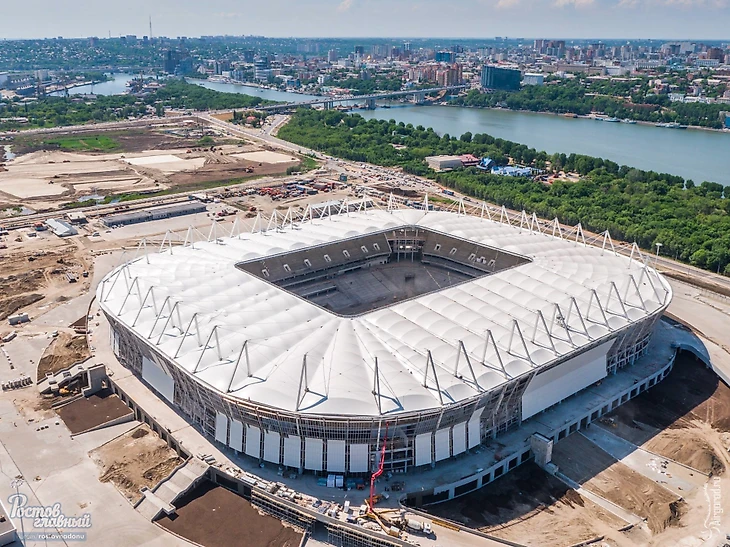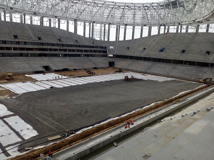 Стройка в Ростове, пожалуй, ближе всех к завершению. Железобетонные работы практически завершены, крыша полностью закрыта мембраной, на данный момент в активной фазе - работы по устройству основания футбольного поля (если более конкретно, происходит монтаж дренажной системы) и обшивке фасада. Совсем скоро должны приступить к засеву травы.
