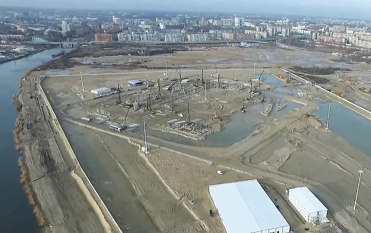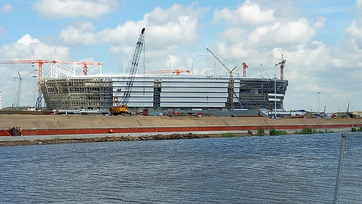 Еще один лидер по темпам строительства, причем лидер весьма неожиданный. Изначально стройка в Калининграде была одной из самых проблемных (возможно, даже самой). Еще полтора (!) года назад место, где сейчас красуется почти готовый стадион, выглядело вот так.