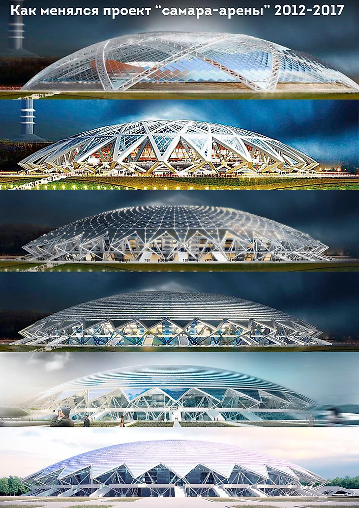 Недавно в сети появился коллаж, описывающий изменение проекта стадиона. Можно увидеть, как медленно, но верно проект упрощался и удешевлялся с течением времени.