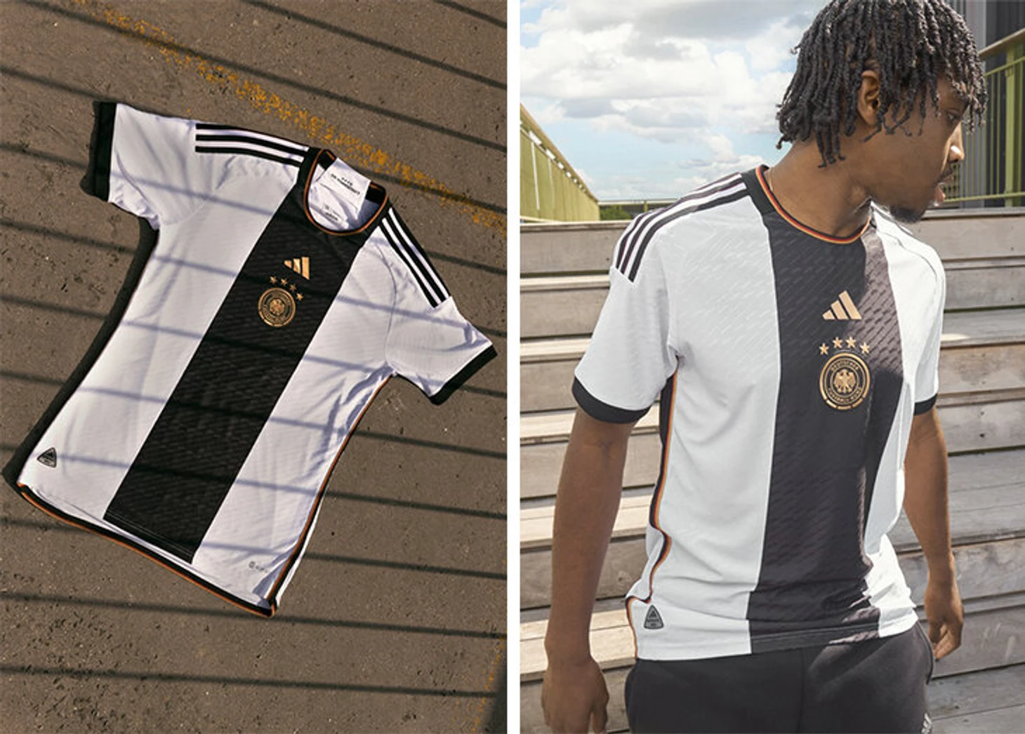 Домашний комплект сборной Германии сочетает белую основу с черным и металлическим золотом. На воротнике и по бокам переливаются цвета немецкого флага.