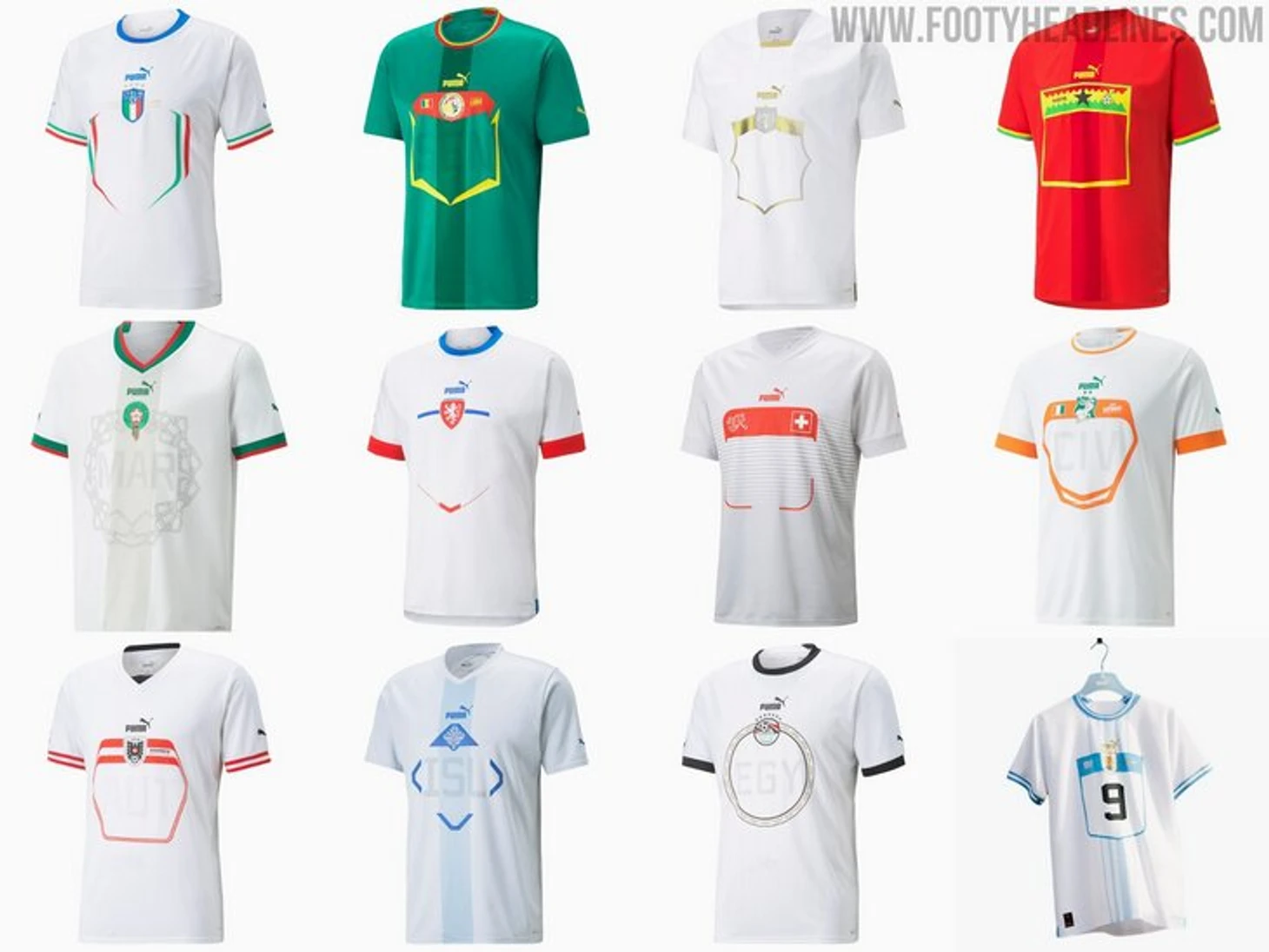 Puma наверняка получит много критики: мало того, что все футболки одного шаблона, так еще и 10 из 12 форм белого цвета. Выделились только Гана и Сенегал, но это только потому, что у них белая домашняя форма.