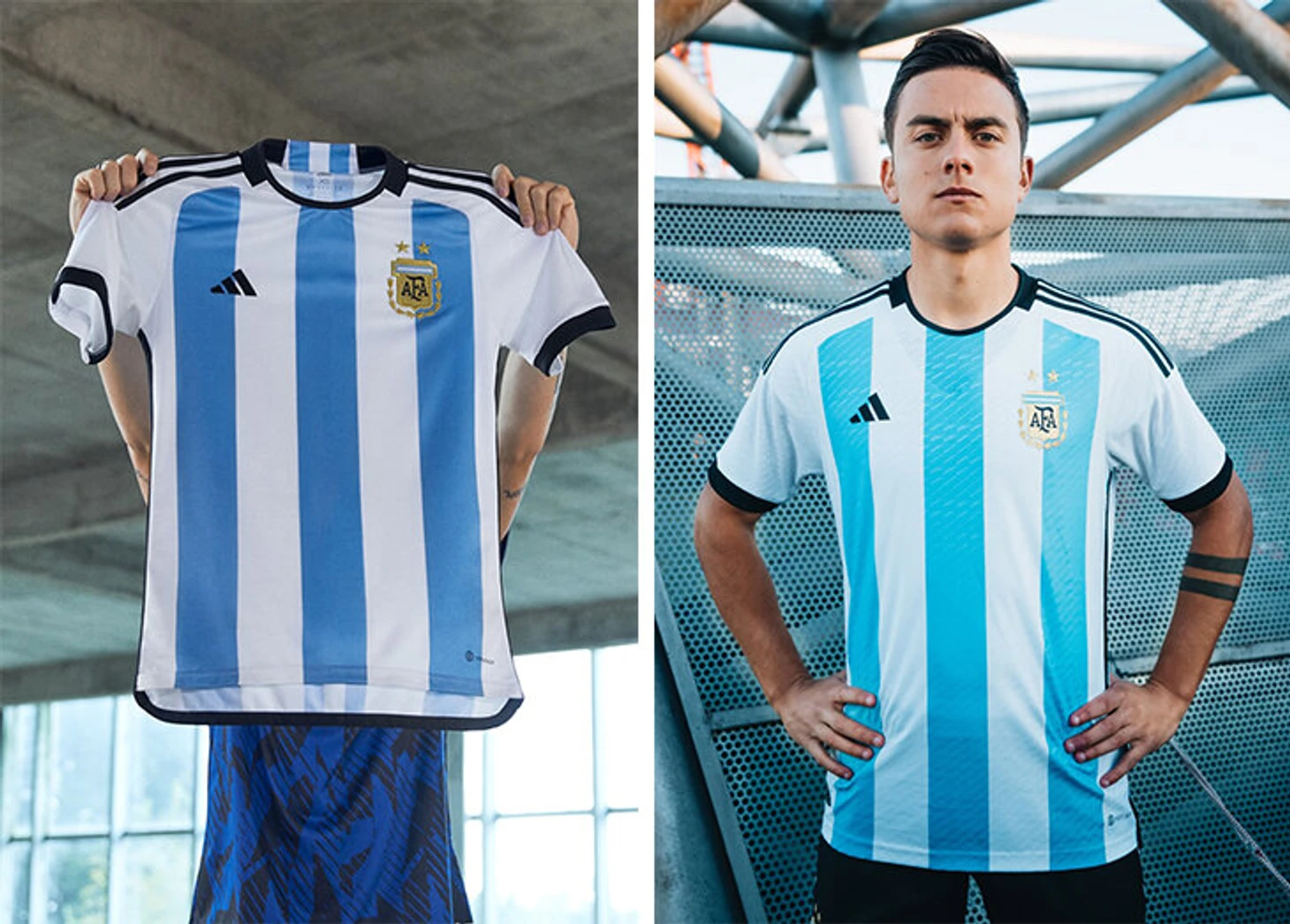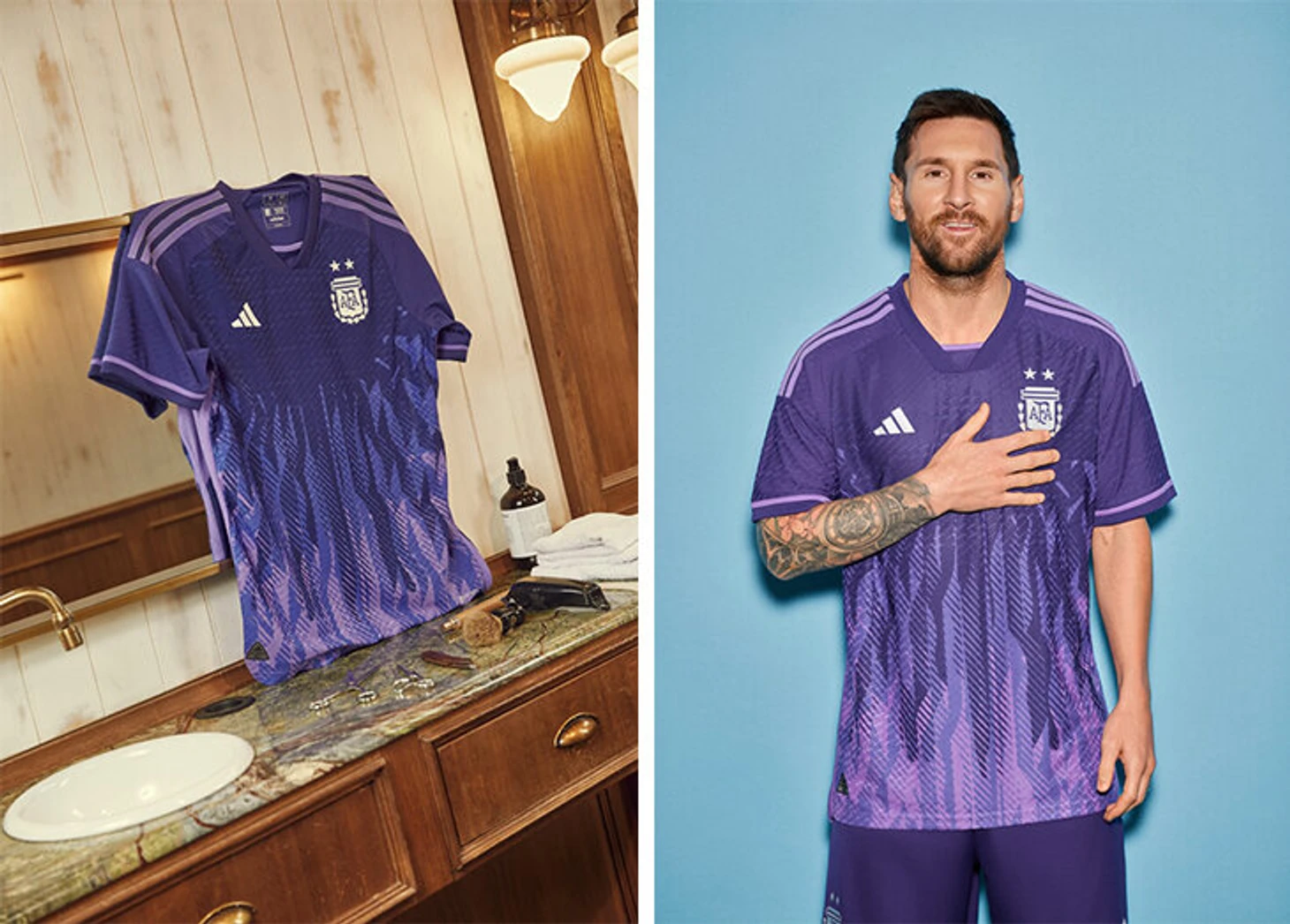 Домашнюю форму аргентинцы показали еще в июле, однако теперь она впервые представлена вместе с выездной. На основной футболке вроде бы обычные бело-голубые полосы, но только спереди. На спине две тонкие полоски по центру совмещены с двумя широкими по краям.