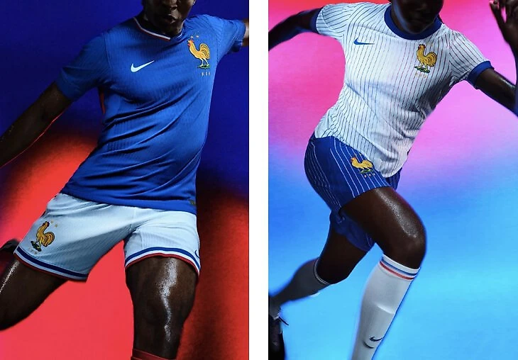 Первое, что бросается в глаза: увеличенная эмблема символа Франции – галльского петуха, который раскрашен в желтый и красный цвета. Это отсылка к формам сборной в 1980-х годах.