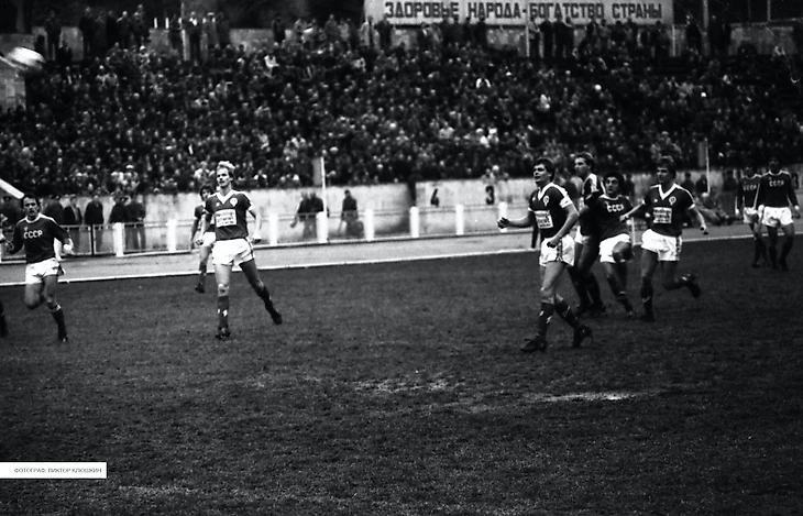По кромке поля можно заметить социалистические лозунги и баннер с рекламой лотереи «Спорт Лото».
