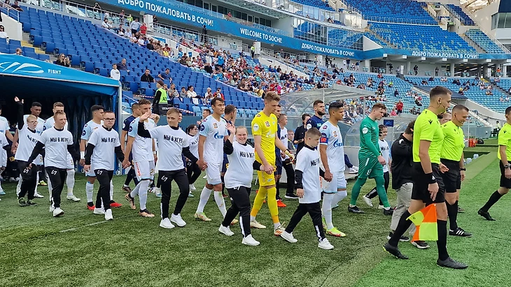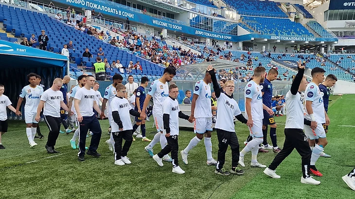 На новый свежеуложенный газон стадиона «Фишт» игроков обеих команд на поле выводили участники команды «47 в Игре» – футбольного клуба для людей с синдромом Дауна.
