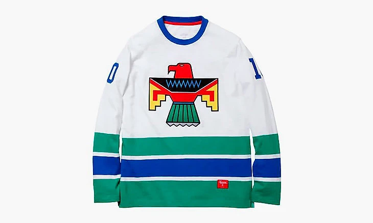 В 2010-м Supreme только забралась на волну хайпа; бренд осторожно выпустил оригинальную хоккейную джерси в двух цветах.