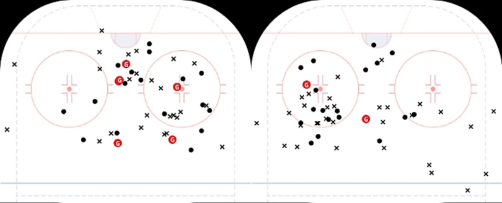Все правильно: в левой нет перекоса к одному из кругов вбрасываний и очень много неудачных попыток бросков с пятака, из слота и даже с линии ворот – так бросал Никита Кучеров. Странно говорить о проблемах с результативностью, но если бы он забивал с процентом Нюландера, тот отставал бы от него на три-четыре шайбы.
