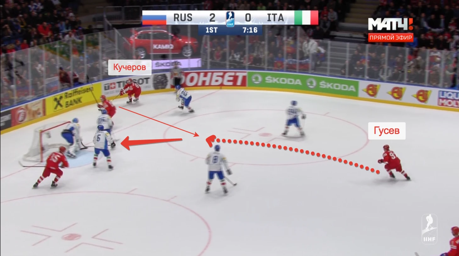 Это лучше всего показывать на видео, но коротко можно и на словах. Дело даже не в том, что большинство передач они адресуют друг другу. И тем более они не катаются друг за другом, ожидая передачу – в хоккее невозможно играть накоротке постоянно. Кучеров и Гусев не пасуются накоротке – они очень часто находятся вообще на разных бортах. Но они будто бы переговариваются по вшитой рации, как «Мстители»: между ними несколько метров, один делает движение, чтобы открыться, а другой видит это – и отдает неожиданную передачу, имея другие, очевидные и простые варианты. Вот пример из матча с Италией: Гусев сделал шаг от синей линии, Кучеров на лицевом борту, но все видит – и через мгновение покатит партнеру под бросок, хотя напрашивается совсем другое решение.