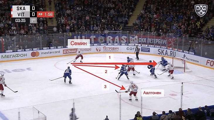 Обычно начинает розыгрыш Семин, приоритет которого – прострел на пятак (залететь может и от коньков защитника), потом – пас под бросок Аалтонену, третий вариант – бросок по воротам. Если вы слышали про кисти Александра, вы понимаете, насколько это все может быть опасно – и оно так есть. Вот миг до гола в ворота СКА: в этот раз Семин выбрал бросок, но также были вторая и третья опции – прострел и пас Аалтонену.