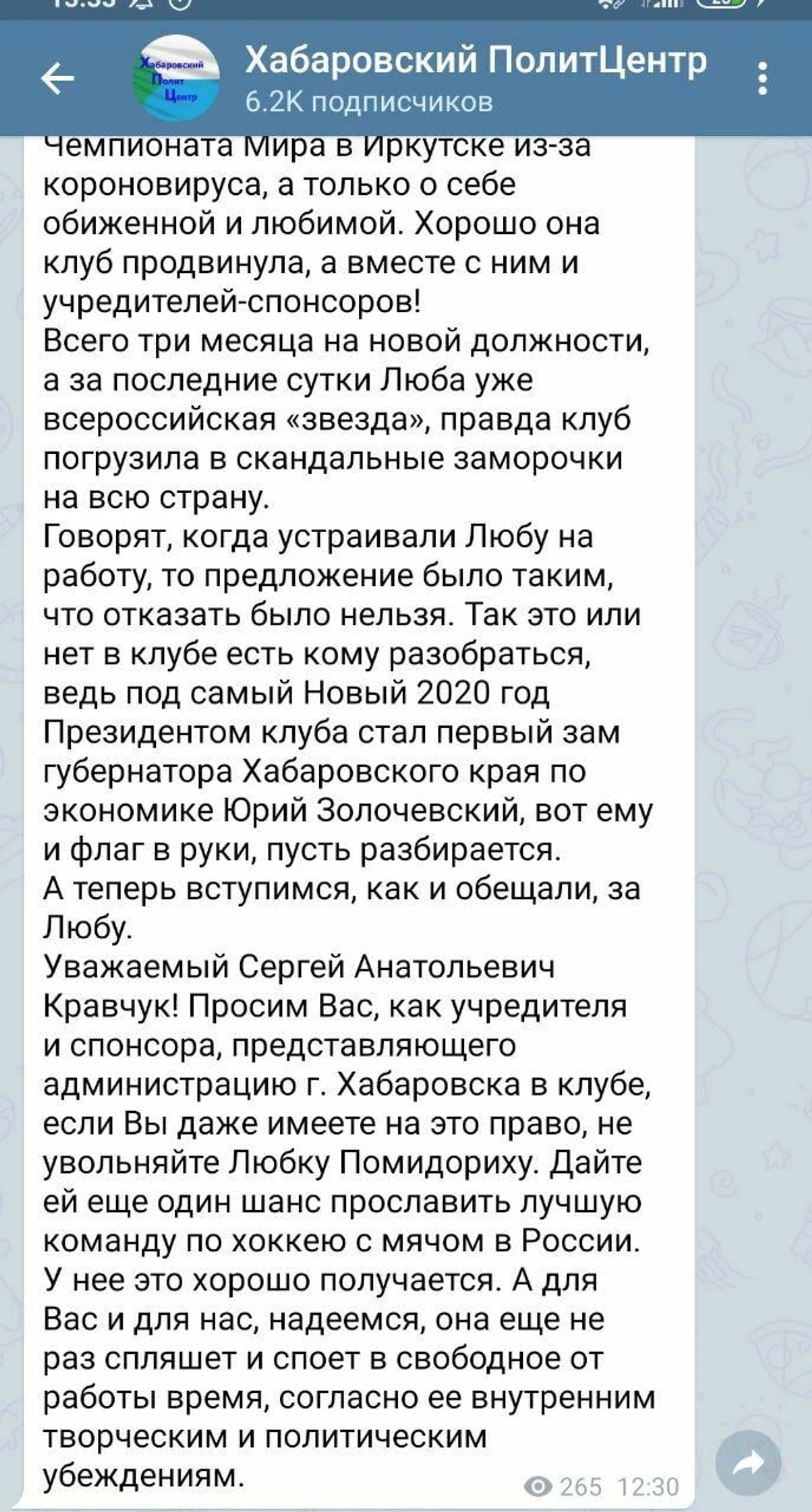 «Сегодня мэр Хабаровска Сергей Кравчук позвонил моему директору с требованием уволить меня с работы. Уже почти три месяца я работаю специалистом по продвижению в хоккейном клубе «СКА-Нефтяник». Так вот, Кравчук дал директору трехдневный срок на мое изгнание из клуба. Если этого не случится, мэр угрожает лишить клуб финансирования. Причина ненависти Кравчука ко мне – мой блог на YouTube и моя личная гражданская позиция», – написала Любовь.