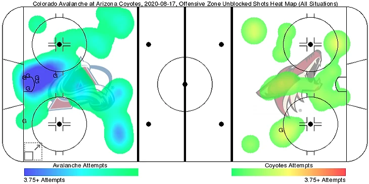 Вот как выглядит карта бросков матча, в котором одна из команд победила 7:1 и владела соответствующим результату преимуществом. Это броски из игры «Колорадо» и «Аризоны» от 17 августа. Вот тут крупная победа просматривается без особых проблем.