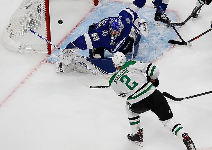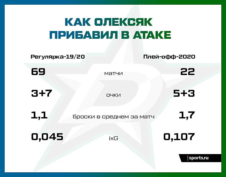 В 21 матче плей-офф-2020 – уже ixG = 2.26. И это без учета первого матча с «Тампой», где у Олексяка есть заброшенная шайба и как минимум два очень опасных броска.