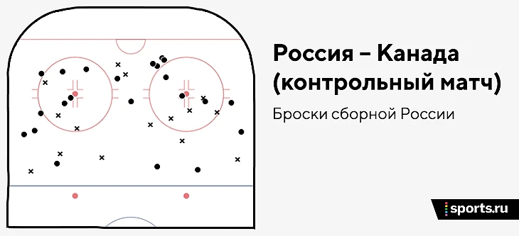 В контрольном матче с Канадой мы атаковали мало и не очень эффективно – вот как выглядит карта бросков оттуда (и снова – все данные мы подсмотрели у Instat).