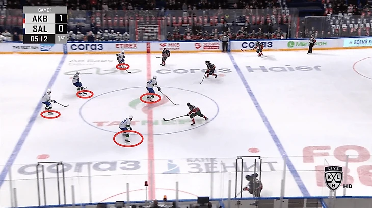 Вот то же самое буквально через минуту – чтобы вам было не так больно смотреть, я немного ускорил видео. «Салават» тут еще и проводит смену – то есть получилось вообще очень долго. Ну и посмотрите, как спокойно «Ак Барс» привел тройку нападающих в чужую зону, чтобы все это дело контролировать.