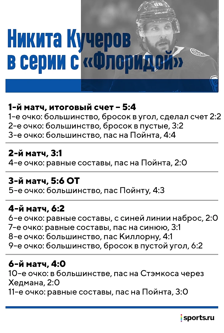 В этих шести адских матчах у главной звезды «Лайтнинг» 11 (3+8) очков – а если вы помните, для Никиты Кучерова это вообще первые шесть матчей в этом сезоне.