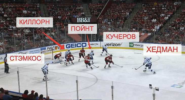 Но тут мы говорим про Кучерова – потренировав защиту и вратаря «Флориды» своим броском, Никита подключил другие опции, каждая из которых рвала соперника в клочья. Второй вариант решения – пас на Пойнта. Когда вратарь уже привык к тому, что из зоны Кучерова идет быстрый бросок, Никита показал намерение бросить, а сам быстро перевел в центр на Пойнта – тот в один темп забил в пустые.