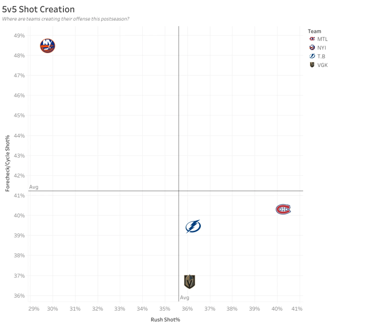 Снова данные аналитика Кори Шнайдера по полуфиналам Кубка Стэнли-2021: количество бросков из атак с ходу и из позиционного нападения.