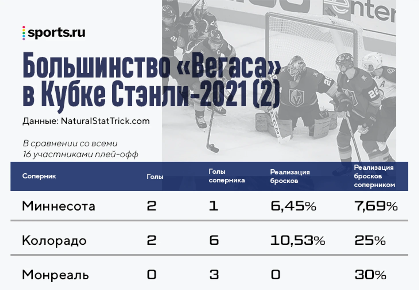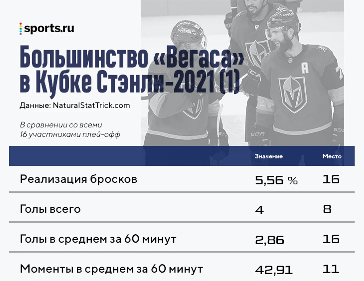 Но стоит только нырнуть в соседние статистические вкладки, все сразу становится намного хуже. По итогам плей-офф-2021 «Вегас» – одна из худших команд по игре в большинстве. Причем если показатели активности – нанесенные броски в створ и, соответственно, ожидаемые голы – у «Найтс» в порядке, то все, что отражает эффективность, реализацию, – на нуле.
