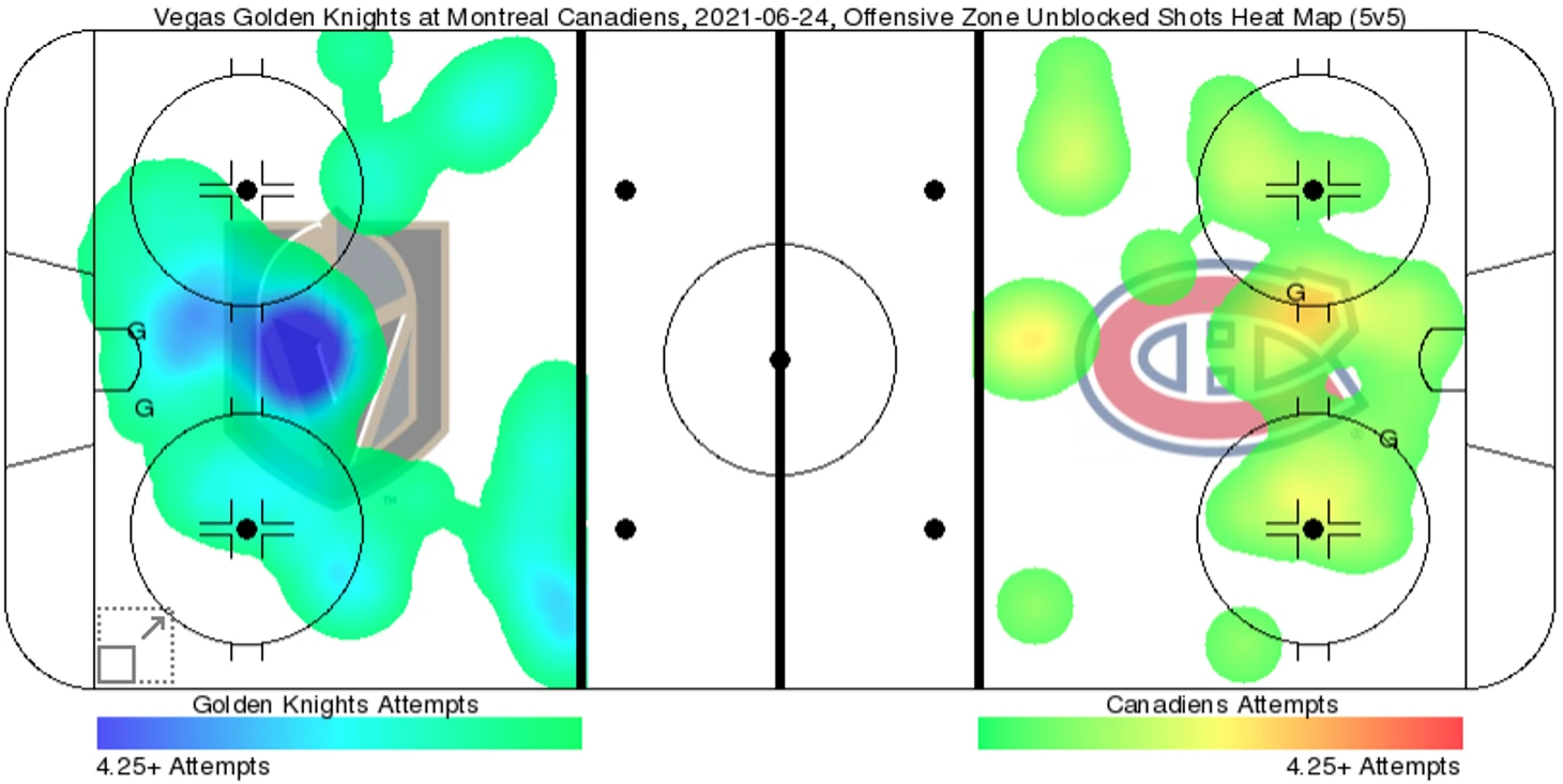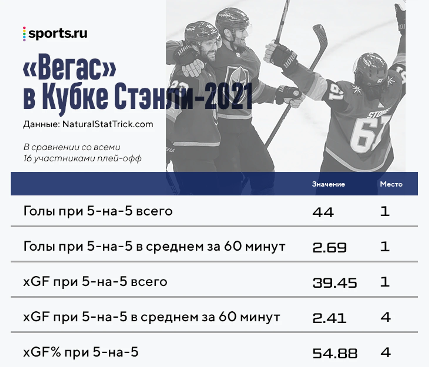У «Найтс» больше всего в этом плей-офф шайб в ситуации 5-на-5, больше всех шайб в равных составах в среднем за 60 минут, больше всех ожидаемых голов в ситуации 5-на-5.