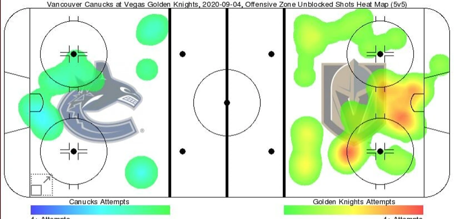 В решающей игре 4 сентября (плей-офф-2020 проводился в экстренном режиме и бэк-ту-бэки там были нормой) «Ванкувер» героически держался. До 53 минуты матча счет был 0:0 – и где-то в это время я пообещал себе, что если «касатки» победят, распечатаю тепловую карту бросков и повешу дома на стену.