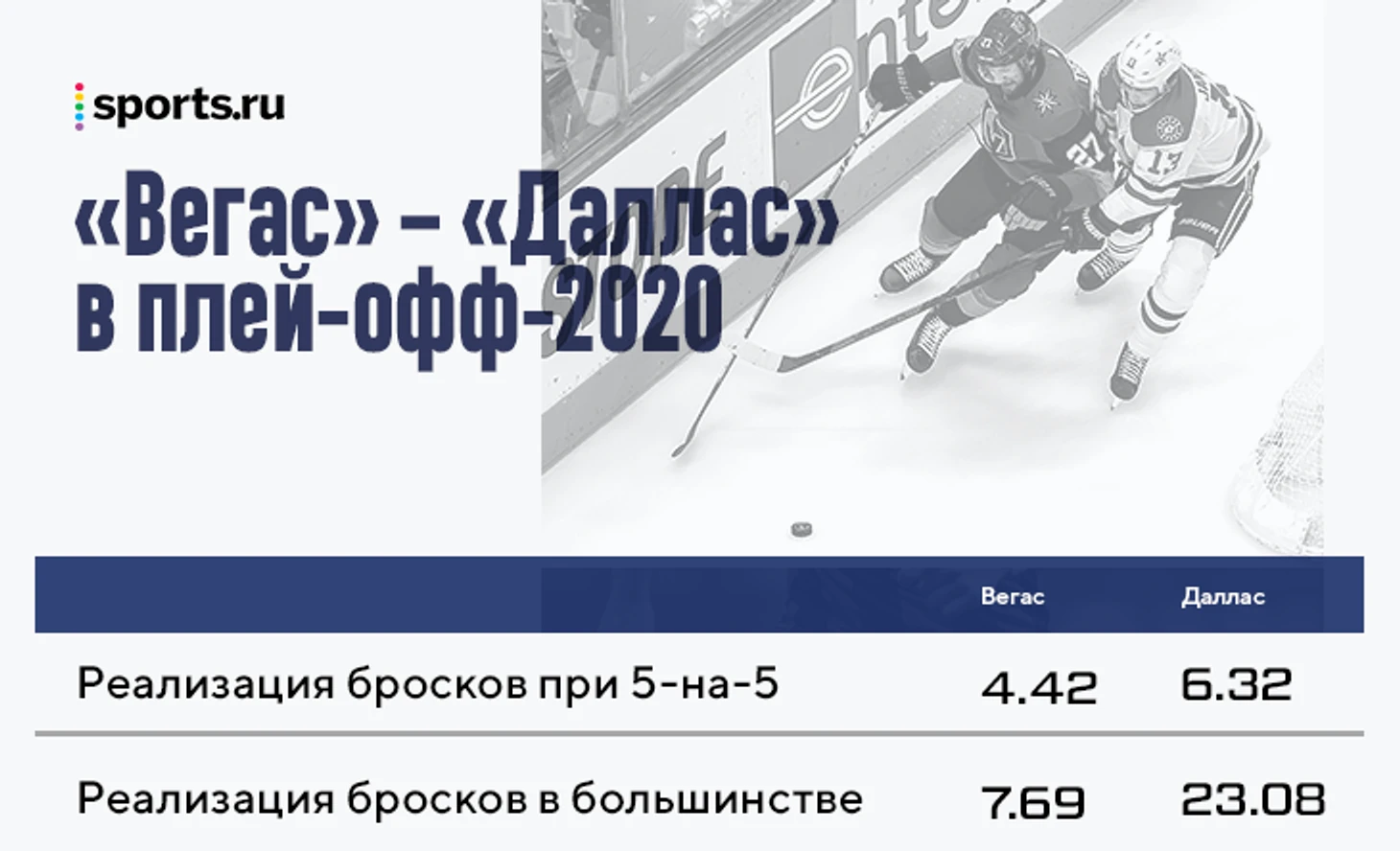 И с этим у «Вегаса» плохо. Осенью-2020 на этой же стадии сезона у него были такие же проблемы: позиционное нападение и, соответственно, игра в большинстве просто вставали – на фоне не идеального, но очень собранного соперника, который убивался на своем пятаке и цеплялся за каждое большинство. Вот, посмотрите на реализацию бросков в финале Запада-2020