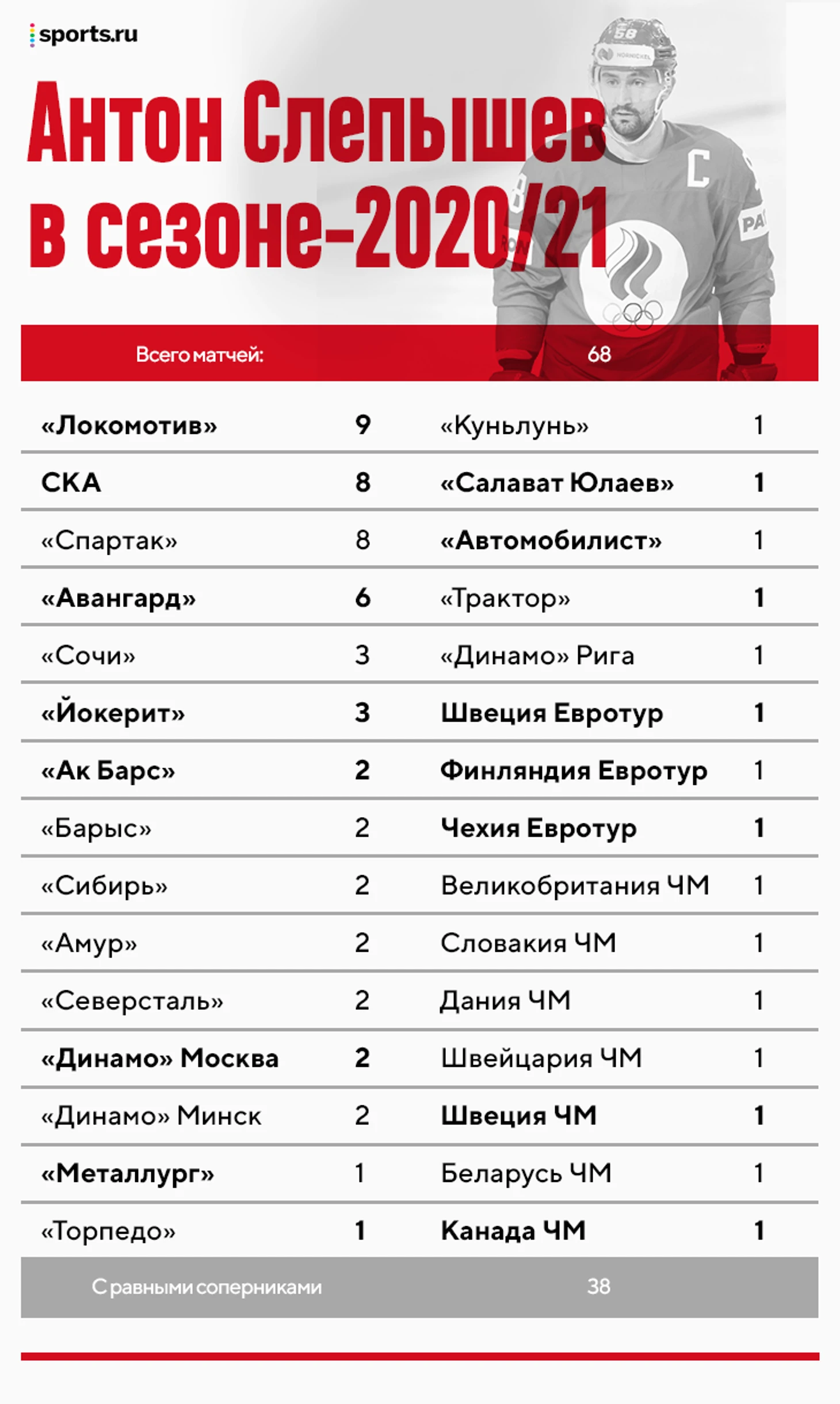 Давайте посмотрим каким был сезон у моего любимого игрока из этого состава, Антона Слепышева. Он сыграл 68 матчей – КХЛ, Евротур и чемпионат мира. Из этого числа 30 игр – с командами, которые наглухо отстают от ЦСКА или сборной России в классе.