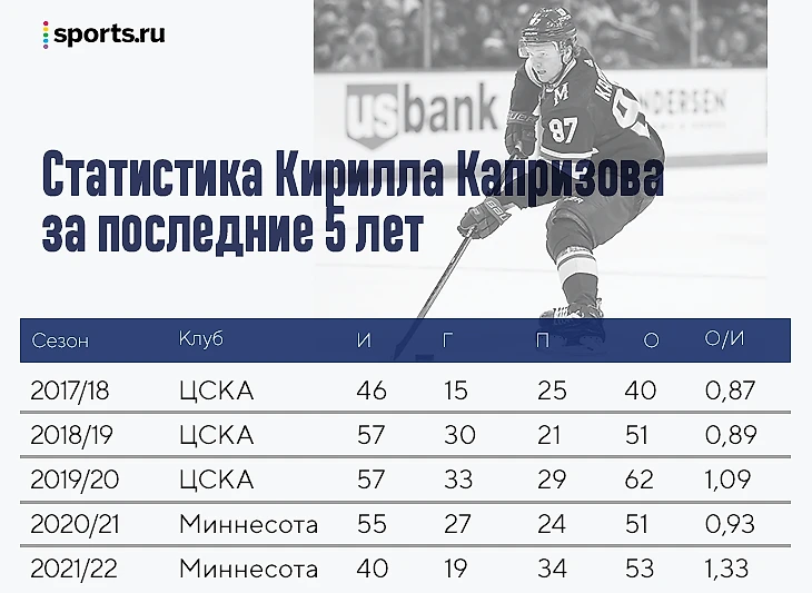 ЦСКА был и остается командой с очень глубоким по меркам КХЛ составом, в котором было 5-6 готовых звеньев. Что такое 5-6 звеньев? Это ротация и игра за счет свежести, то есть да – постоянные и очень короткие смены. В последнем сезоне за ЦСКА Капризов играл в среднем меньше 17 минут: то есть при всей очевидности его таланта в ЦСКА его держали на минутах, которые в НХЛ дают хоккеистам 2-3 звена. В «Миннесоте» он сразу же, автоматом получил на минуту больше, а в этом сезоне играет в среднем по 19 минут.